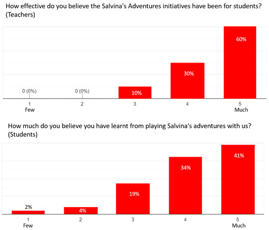 Figure 7. Cumulative values showing percentage of the feedback received for the first question from teachers and students, concerning all the played Salvina’s adventures.