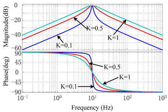 where x(s) and x’(s) are the input and output signals, respectively, ω′ is the center frequency of this filter, and k is the damping factor. According to the Routh criterion, it can be seen from the transfer function that the stable condition of the system is kω > 0. Therefore, as long as k is greater than 0, the system is stable.
