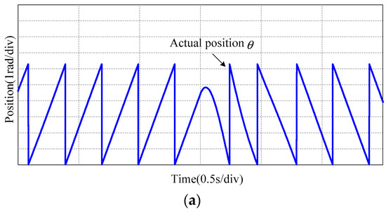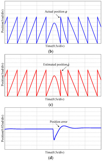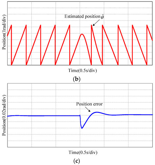 Figure 8 shows the experimental results of the proposed method from forward 50 r/min to reverse 50 r/min. Figure 8a–c show the actual position , estimated position and the rotor position error, respectively. The experimental results show that the steady-state error is about 0.001 rad at 50 r/min, and the maximum rotor position error is 0.04 rad at the moment of speed change.