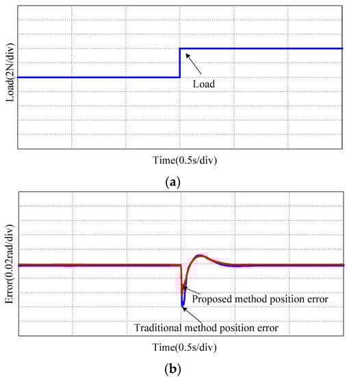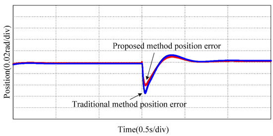 The error comparison curves of the two methods during the load change are shown in Figure 10. Figure 10a is the given load, and Figure 10b is the rotor position error comparison curves. It can be seen that the error of the proposed method is about 0.02 rad smaller than that of the traditional method when the load changed.