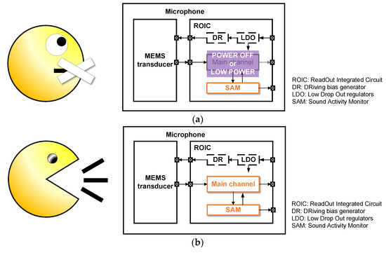Figure 1 shows a microphone operation scenario to achieve low average power consumption. The ROIC consists of a low drop-out voltage regulator (LDO) for generating power, a drive bias generator (DR) for driving the MEMS transducer, a main channel for measuring sound, and a sound activity monitor (SAM) for detecting the presence of sound. Figure 1a shows no sound input and the ROIC operating in a low power mode. In low power mode, only elements for the MEMS transducer drive and SAM functions operate normally, while others operate in low-power or power-off mode. Therefore, the SAM must be operated at extremely low power consumption. When the SAM detects an external sound, as illustrated in Figure 1b, the ROIC operates in a normal power mode. In normal power mode, the SAM detects silence and putsthe ROIC in a low power mode again.