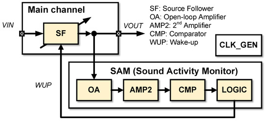 Figure 2 shows a top-view configuration of the circuit that will be covered in this paper. The top circuits include SF, SAM, and CLK_GEN. The SAM block consists of an open-loop amplifier (OA), a second amplifier (AMP2), a comparator (CMP), and a decision logic circuit (LOGIC). The CLK_GEN block generates the clock used by the LOGIC block. Initially, when there is no external sound input, the WUP signal is logically low (LOW) and the SF operates in low power mode. In low power mode, the source follower is not turned off completely and is operated with a low bias current of 100 nA level. The SF block consists of a stack type of PMOS acting as a source follower and NMOS supplying current to the source follower. The current flowing through the source follower can be controlled by adjusting the gate bias of the NMOS. When an external sound starts to be input, the SAM recognizes it and the WUP signal becomes logically high (HIGH), so the SF starts to detect the sound in normal power mode. In normal power mode, the source follower operates with a normal bias current of 7 µA level.