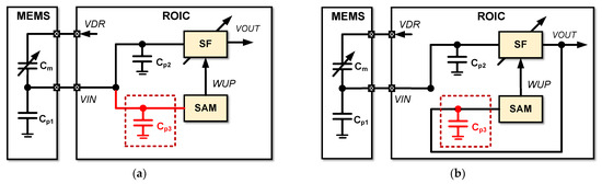 in which VDR is the driving voltage of the MEMS device, Cm is the MEMS capacitance of the microphone, Cp1 is the parasitic capacitance of MEMS, Cp2 is the input capacitance of SF, and Cp3 is the input capacitance of SAM. As shown in Equation (1), the sensitivity of the MEMS device decreases due to the input parasitic capacitance Cp3 of SAM. Therefore, in order to improve the MEMS sensitivity, it is necessary to minimize the parasitic capacitance connected to the input terminal from the MEMS. Figure 3b shows the proposed SAM connection configuration. The SAM is not connected to the input port of the MEMS, but to the output of the SF. In the proposed SAM connection configuration, the MEMS sensitivity is improved according to the following equation