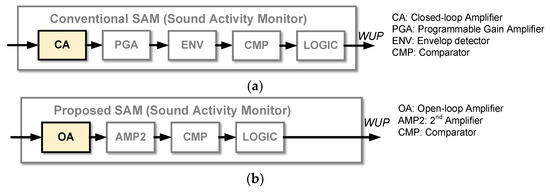 The front-end amplifier of the conventional SAM uses a closed-loop amplifier (CA) as shown in Figure 4a, and the front-end amplifier of the newly proposed SAM uses an open-loop amplifier (OA) as shown in Figure 4b. Typical amplifiers are designed in a closed-loop architecture to obtain accurate amplification gains. The front-end amplifier only needs to amplify a signal corresponding to a low sound by a certain amount or more, so an accurate amplification gain is not required. The closed-loop amplifier scheme to obtain an accurate gain consumes the area of four capacitors to create a gain ratio, a phase compensation capacitor, and a phase compensation resistor. The closed-loop amplifier should perform phase compensation to secure stability, which results in reduction of frequency bandwidth. Therefore, in order to obtain the desired closed-loop bandwidth, more current must be consumed to secure the higher bandwidth before compensation. In the case of open-loop amplifiers, capacitors for amplification ratio and stability compensation passive components are not required, improving area and power consumption.