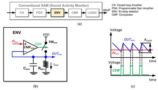 Figure 5a is a conventional SAM configuration. The envelope detector (ENV) extracts the envelope of the amplified signal via CA and PGA and compares the signal magnitude in the comparator (CMP). A typical envelope detector shown in Figure 5b consists of a big resistor (Renv) that causes a fine leakage current, a big capacitor (Cenv) to maintain an output voltage, a current supply switch (SWenv) to increase a voltage of an output signal (OUTenv), and a comparator (CMPenv) that compares the amplitude of an input signal with the current output signal (OUTenv) [14,15]. If the magnitude of the signal (INenv) is smaller than the magnitude of the output signal (OUTenv), the comparator output (CSW) becomes logically low (LOW) and the switch (SWenv) will be turned off. Then, as the charges stored in the capacitor (Cenv) are discharged through the resistor (Renv), the voltage of the output signal (OUTenv) gradually decreases. As the output signal (OUTenv) gradually decreases and becomes smaller than the input signal (INenv), the output of the comparator (CSW) becomes HIGH and the switch is turned on. While the switch (SWenv) is turned on, current is supplied through the switch (SWenv), so that a charge is supplied to the capacitor (Cenv) and the output voltage (OUTenv) rises rapidly. Therefore, even if a DC signal is input to the envelope detector (ENV), the envelope detector output signal (OUTenv) takes a sawtooth shape as charging and discharging are repeated in the capacitor (Cenv). For this reason, as shown in Figure 5c, a ripple of size Aripple occurs in the output signal of the conventional envelope detector. Since such a ripple (Aripple) is not distinguished from the small sound signal, it defines a limitation of measurable sound. In addition, detecting the presence of sound after extracting the envelope of sound hinders rapid detection. Therefore, the use of envelope detectors in terms of low-sound detection and fast detection is disadvantageous, and the envelope detector is removed from the conventional SAM configuration as shown in Figure 4b.