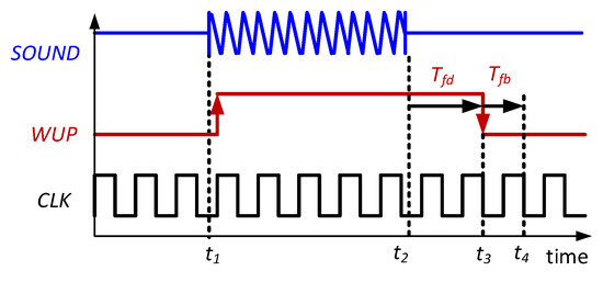 Architecture approach 5: After a predetermined delay time (Tfd) elapses after the sound input disappears at t2, a falling edge at t3 is expressed as a wakeup signal (WUP).