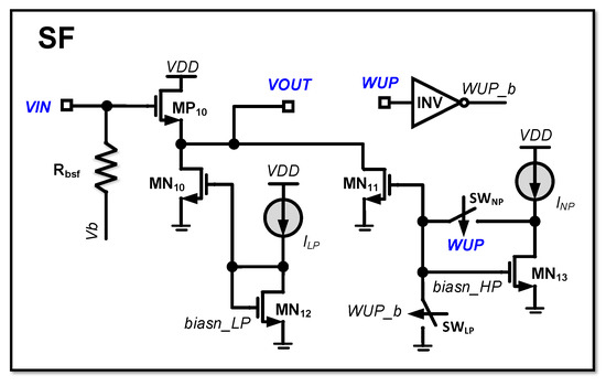 Figure 7 shows a detailed circuit diagram of the source follower block (SF). The device that functions as a source follower is MP10 and transmits an AC signal from the input (VIN) to the output (VOUT). The DC voltage on the VIN is set to Vb via high resistance (Rbsf). The high-resistance value of the resistor (Rbsf) is implemented as a pseudo-resistor using a PMOS. In the source follower (MP10), current flows as much as ILP in the low power mode and as much as (ILP + INP) in the normal power mode. When the WUP is LOW, it becomes low power mode, and the current ILP mirrored by MN12 and MN10 flows through the source follower MP10. Since the switch SWnp is turned off, the switch SWlp is turned on, and the MOS MN11 is turned off, no additional current is added to the source follower MP10. When the WUP is HIGH, it becomes normal power mode, and the current ILP mirrored by MN12 and MN10 is added to the current flowing through the source follower MP10. In addition, since the switch SWnp is turned on and the switch SWlp is turned off, current INP mirrored through MN13 and MN11 is added to the source follower MP10. Eventually, in normal power mode, a current of (ILP + INP) flows through the MOS MP10.