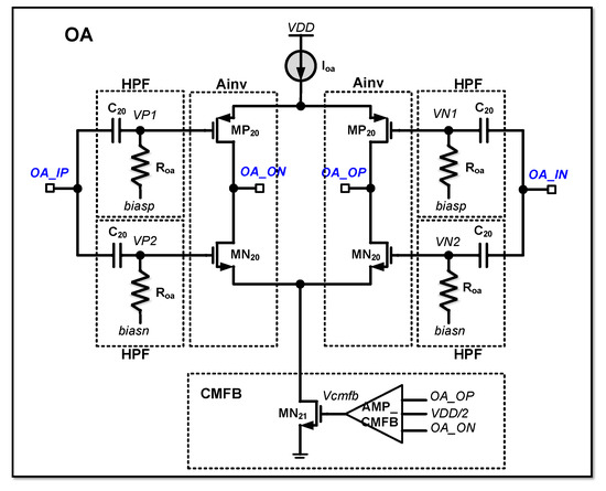 Figure 8 shows the detailed circuit of the OA block. The OA consists of a high-pass filter block (HPF), an amplification block (Ainv), and a common-mode feedback block (CMFB). The high-pass filter (HPF) removes DC and low-frequency components input from SF and is implemented with MIM capacitor (C20) and PMOS-based pseudo-resistor (Roa). The amplification block (Ainv) is implemented as an inverter-based amplification architecture. Inverter-based amplifiers are commonly used because of their simple structure and good efficiency [16,17]. While inverter-based amplifiers may have poor linearity for large inputs, nonlinearity during amplification is not an issue in SAM applications. Current Ioa is supplied from the top of Ainv and flows through a differential inverter-based amplifier to NMOS (MN21) functioning as common-mode feedback control. When the common-mode voltage of OA output is greater than VDD/2, Vcmfb increases and the current flow of NMOS improves, so that the common-mode voltage of OA output decreases. On the contrary, when the common-mode voltage of the OA output is less than the VDD/2, the Vcmfb decreases and the current flow of the NMOS (MN21) decreases, thereby increasing the common-mode voltage of the OA output.