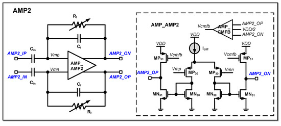 Figure 9 shows the detailed circuit of the AMP2 block. The AMP2 performs additional amplification, low cutoff-frequency adjustment, and common-mode signal removal. AMP2 has a charge amplifier structure, and the amplification ratio is defined as a ratio of Cin/Cf [18,19,20]. The low cutoff frequency (fc_low) is determined by the feedback resistor Rf and the feedback capacitor Cf. as in Equation (3). The low cutoff frequency can be changed by adjusting the feedback resistance. Since the feedback resistor Rf needs to have a large resistance value, it is implemented as a PMOS-based pseudo-resistor. The internal amplifier (AMP_AMP2) of the second amplifier (AMP2) consists of a two-stage amplifier structure and a common-mode feedback block.
