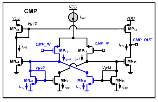 Figure 10 shows the detailed circuit of the CMP block. Differential input is amplified using a well-known positive feedback architecture [21]. The operation of the comparator when the value of CMP_IN momentarily decreases while in a complete symmetrical state will be described as follows. A momentary decrease in the gate voltage CMP_IN of MP40 causes an instantaneous increase in the current ip40. A current ip40 flowing in the MP40 is composed of a current in40 flowing in the MN40 and a current in42 flowing in the MN42. Since the gate voltage of MN42 is still fixed to Vg43, MN42 current in42 flows as before, and an increase in current ip40 leads to an increase in current in40. As the Vg40 increases, the current in41 of MN41 increases and the current in43 of MN43 decreases. As the current in43 decreases, the voltage Vg43 also decreases, and the current in42 of MN42 also decreases. Due to the increase in ip40, in42 decreases and in40 increases continuously. As a result, Vg40 continuously increases and Vg43 continuously decreases. The increased Vg40 increases ip42, decreases Vg42, and increases the current flowing through MP43. Meanwhile, the reduced Vg43 reduces the current flowing through the MN45. The increase in the current of MP43 and the decrease in the current of MN45 cause CMP_OUT to become HIGH. In the same principle, if CMP_IN is higher than CMP_IP, the output CMP_OUT becomes a logical low state.