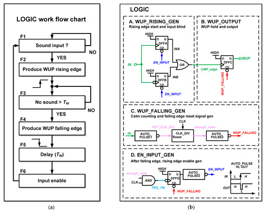 Figure 11b shows the detailed circuit configuration of the LOGIC. The LOGIC consists of four blocks: ‘A. WUP_RISING_GEN’ and ‘B. WUP_OUTPUT’, ‘C. WUP_FALLING_GEN’ and ‘D. EN_INPUT_GEN’. In block “A. WUP_RISING_GEN”, after the LOGIC reset, both the output INA of the D flip-flop DFFA and the output INB of the D flip-flop DFFB are in the low state. When a rising edge occurs in the input IN, the DFFA outputs HIGH to the output INA, and when a falling edge occurs in the input IN, the DFFB outputs a logic low value to the output INB. The DFFA output INA and DFFB output INB use a OR gate to generate a CMP_edge signal. That is, whether a rising edge or a falling edge occurs in the input signal IN, a rising edge at t1 is generated in CMP_edge by a faster edge at IN as shown in Figure 12.