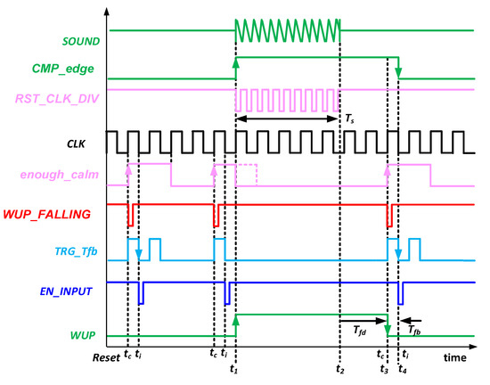 The WUP signal with HIGH should be changed to a logical low value if the silence persists. Block ‘C. WUP_FALLING_GEN’ generates a low active reset signal of WUP_FALLING at t3 when there should be a falling edge of WUP. Block C consists of CLK_DIV and two AUTO_PULSEs before and after CLK_DIV. As shown in the lower right corner of Figure 11b, the AUTO_PULSE typically outputs HIGH and then generates a low active reset signal as soon as a rising edge occurs on the next input signal. The block CLK_DIV divides the frequency of CLK by a multiplication ratio of 2 according to the register setting. As can be seen in the Ts interval in Figure 12, if the sound input continues to generate rising edges at the input IN, AUTO_PULSE1 generates a repeated low active reset signal on the output signal RST_CLK_DIV and resets the CLK_DIV. Then, the CLK_DIV output (enough_calm) remains in the low state continuously. At every tc in Figure 12, the rising edge of enough_calm generates a low active reset signal in the output signal WUP_FALLING of AUTO_PULSE2. Eventually, the low active reset signal of WUP_FALLING resets the DFFC, and a falling edge is generated in the WUP signal. As a result, the time Tfd from the start of silence to the occurrence of the falling edge of the WUP corresponds to the half-cycle time of the signal enough_calm. If there is continuous silence, enough_calm has a periodic square waveform, and a periodic low active reset signal is generated in WUP_FALLING to keep the WUP signal at a low logical value as shown in Figure 12.