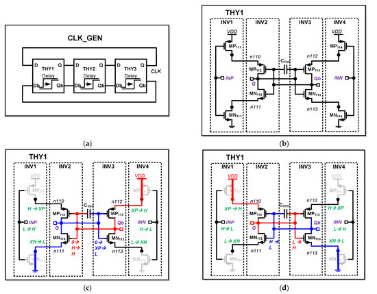 Detailed circuit diagram of CLK_GEN: (a) Configuration of CLK_GEN; (b) Detailed circuit of THY; (c) Operation voltage when INP becomes HIGH; (d) Operation voltage when INP becomes LOW.