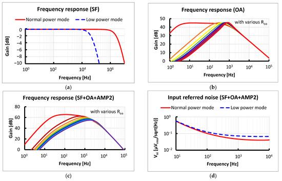 Figure 15c shows frequency response characteristics of blocks continuously connected in the order of SF, OA, and AMP2. It can be seen that the low cutoff frequency varies from 30 Hz to 720 Hz according to the AMP2 feedback resistance setting value. The high cutoff frequency is also affected by the AMP2 feedback resistance value Rf setting and ranges from 1.4 kHz to 3.7 kHz. The amplification gain has a maximum of 63 dB (1395 V/V) and a minimum of 55 dB (560 V/V). Because ‘OA + AMP2’ blocks have much lower bandwidth than the SF bandwidth of 56 kHz in low-power mode, their combined frequency response characteristics show the same characteristics regardless of the power mode of SF.