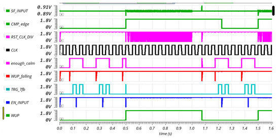 Figure 16 shows the simulation results for the full chain from SF to LOGIC. As shown in the SF_INPUT of Figure 15, a signal consisting of no wave for 0.5 s and a sine wave having an amplitude of 1 mVpk and a frequency of 1 kHz for 0.5 s was repeatedly supplied to the SF. As soon as the signal was input at 0.5 s, a rising edge was generated at the CMP_edge, which soon generated a rising edge of the WUP signal. The input signal was cut off at 1 s, but it can be seen that the WUP signal continues to maintain at HIGH even after 1 s. After the SF_INPUT signal was cut off at 1 s, a rising edge occurred in the enough_calm signal after 2 cycles of CLK, and the low active reset signal in the WUP_falling signal caused a falling edge in the WUP signal. Since the CMP_edge is still in HIGH, the input reaction of the LOGIC block “A. WUP_RISING_GEN” is in the deactivated state. Afterwards, it can be seen that the low active reset signal of the EN_INPUT signal is generated at the first falling edge of the TRG_Tfb signal generated by synthesizing enough_calm and CLK. The low active reset signal value of the EN_INPUT signal causes the CMP_edge signal to become LOW, and the block A of the LOGIC can react to the input again. Accordingly, it can be seen that the WUP signal becomes HIGH again as the sine wave is input to the SF_INPUT at 1.5 s.