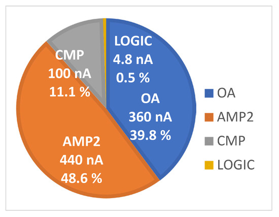 The designed circuit operates at 1.8 V, and the SF block consumes a current of 200 nA in low power mode and a current of 14.3 µA in normal power mode. The details of the DC current consumption of the SAM block are shown in Figure 17. The OA, AMP2, CMP, and LOGIC blocks consume 360 nA, 440 nA, 100 nA, and 4.8 nA, respectively, and the SAM consumes a total of 1 µA of DC current. The clock generator (CLK_GEN) drew an average of 2.1 nA of current. The reduction in power consumption due to the SAM feature may vary according to the user scenario. The average current consumption is 14.3 µA when only the SF block without the SAM block is operated in 24-h normal power mode. When using the SAM function, in normal power mode, SF consumes 14.3 µA and SAM consumes 1 µA, so the total current is 15.3 µA. In low power mode, SF consumes 0.2 µA and SAM consumes 1 µA, so the total current is 1.2 µA. If there is a sound input for an average of 10% of the time of the day, it is used in the low power mode for 90% of the time and in the normal power mode for 10% of the time. Based on 10% of the current consumption of 15.3 µA in normal power mode and 90% of the current consumption of 1.2 µA in low power mode, the average current consumption is 2.46 µA. Without the SAM function, the current consumption is 14.3 µA, and with the SAM function, the average current consumption is 2.46 µA, so the current consumption can be reduced by 83%.