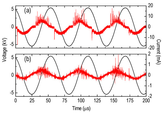 Representative discharge waveforms in absence of liquid target. (a) Voltage (black) and DBD current (red). (b) Voltage (black) and Jet current (red). Operating conditions: 11 kVpp, 17.5 kHz, and 1.5 slm.