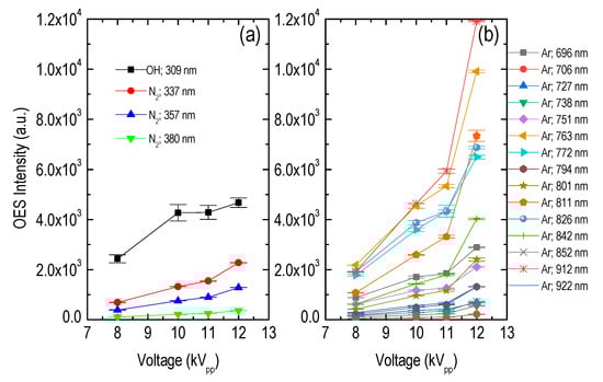 Figure 4, Figure 5 and Figure 6 provide the relative spectral intensity of the abovementioned species, as a function of the voltage amplitude, voltage frequency, and gas flow rate, respectively. In the case of amplitude variation, i.e., Figure 4, species population increases for higher externally applied electric field. This is due to intense ionizing waves, propagating along the argon channel, which outplace and penetrate the atmospheric air [29,42]. Thus, considering the power supply limit of 12 kV peak-to-peak and a rational safety factor, the voltage of 11 kV peak-to-peak is used hereafter.