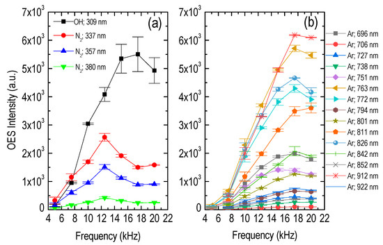 In the case of frequency variation, i.e., Figure 5, the OES intensity peaks around 17.5 kHz for most of the species. In other words, while an increasing frequency promotes species production initially, possibly due to the higher power injected into the system, elevated frequency leads to adverse results eventually. This fact may be attributed to the transition from laminar to turbulent gas flow profile (see discussion on the frequency role in reference [42]), which provokes increased argon-air mixing and disturbs the ionization wave propagation. Thus, the value of 17.5 kHz is applied hereafter.