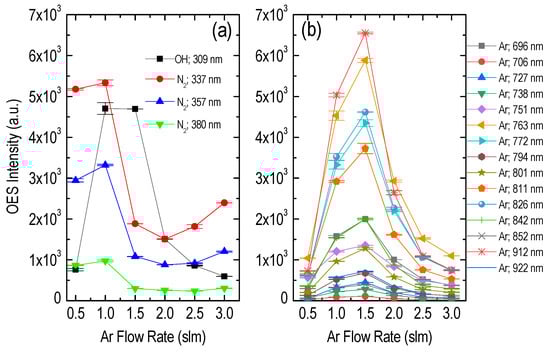 Optical emission intensity of the main emissive species detected as a function of the argon flow rate. (a) N2 and OH species. (b) Ar species. Operational conditions: 11 kVpp and 17.5 kHz. Mean values and standard deviations are calculated from two series of experiments carried out on different dates.
