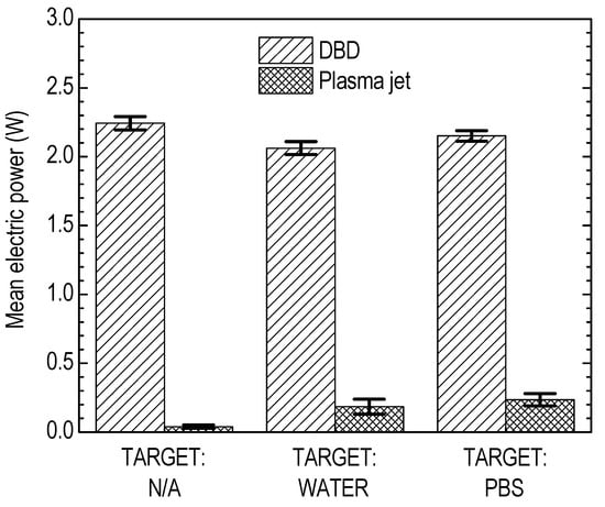 However, the bar charts of Figure 7 picture the influence of the DDW and PBS on the DBD and the plasma jet in terms of power consumption. The system consumes a low power (<2.5 W) with the main fraction of this power being delivered always to the DBD, but the ratio of the plasma jet to the DBD power varies slightly. It is around 2%, 9%, and 11% in the case of the free plasma jet, the DDW, and the PBS target, respectively. Nevertheless, as the optimum operational window is unaffected (i.e., 11 kV, 17.5 kHz, and 1.5 slm), any further concern on the liquid-induced plasma modifications remains beyond the scope of the present study. This study focuses on the plasma-induced liquid modifications.