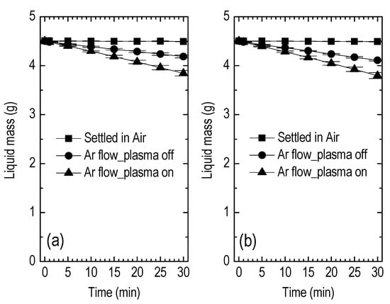 Hereafter, the specimens are treated at the optimized conditions found previously. Firstly, the liquid mass variation versus the time is given in Figure 8 for three different cases, i.e., the specimens are settled in the laboratory air, the specimens are subjected to the argon flow (plasma off) downstream of the reactor orifice, and the specimens are subjected to the argon plasma. For the prolonged time of 30 min, in the first case, the mass of both liquids remains constant, in the second case, a mass reduction of 7% in DDW and 8.5% in PBS is observed, and in the last case, the corresponding percentages are 14.5% and 15.6%.