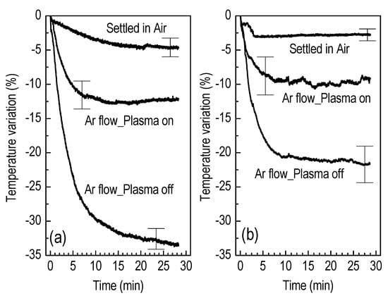 Figure 9 gives the liquid temperature variation (%) at the corresponding cases, following in-situ measurements. The representation of the temperature relative variation instead of absolute values is preferable since it offsets the different ambient temperature on different dates. The given error bars indicate the highest (worst case) deviations found between two series of experiments. Both liquids slightly cool down when they are left in the laboratory air, whereas an important cooling is noted when they are subjected to argon flow downstream of the capillary tube. Interestingly, this cooling is intercepted when the plasma is activated. The effects are more intense in the case of unbuffered water.