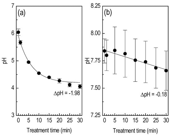 pH evolution versus the treatment time in the case of (a) DDW and (b) PBS. Mean values and standard deviations are calculated from two series of experiments carried out on different dates. Operating conditions: 11 kVpp, 17.5 kHz, and 1.5 slm.