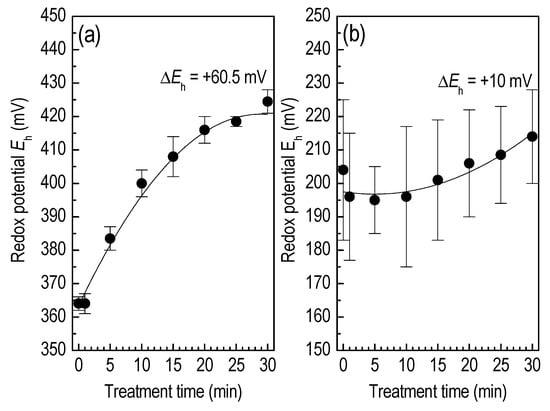 Furthermore, another quantity related to pH and the disinfection efficiency of a liquid is the redox potential, Eh. Redox potential is an indicator of the ability of a solution to oxidize and is related to the oxidizer concentration. Substances like dissolved oxygen will contribute to higher oxidation and higher redox. This substance has higher electronegativity (oxidizing agent) and will normally pull electrons from other substances like unwanted contaminants and bacteria. Under the present conditions, the redox potential of the DDW changes from about 360 mV to 430 mV (ΔEh = +60.5 mV), in an exponential manner, according to Figure 11a. Consistently with the pH measurements, the PBS redox is less affected even after 30 min of treatment (ΔEh = +10 mV); Figure 11b.