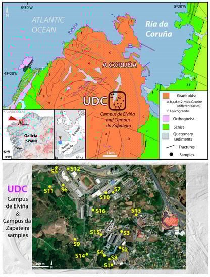 - Cuesta, A.; Gallastegui, G. Magmatismo de la Zona Centroibérica: Galicia occidental. In Geología de España; Vera, J.A., Ed.; SGE-IGME: Madrid, Spain, 2004; pp. 96–100. [Google Scholar]