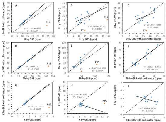- The comparison of geochemical analyses of U, Th, and K with the data obtained by GRS, both with and without a collimator, showed a good correlation—especially for Th—albeit there was some overestimation. The worst correlation was observed for K.