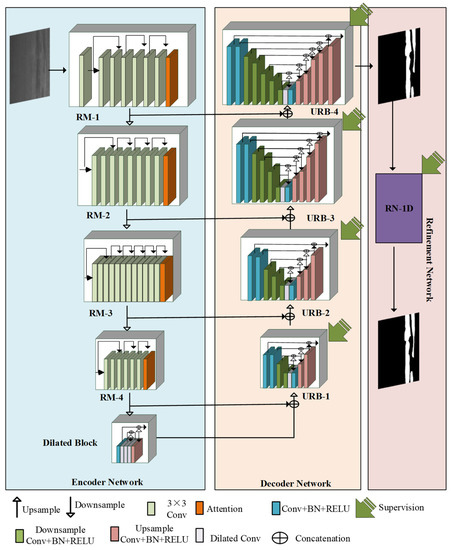 Here, RN_1D uses maximum pooling in the bottom-up way to adjust the feature size and reduce calculation complexity. The reason why we use the maximum pooling operation instead of average pooling is that small defects are easily lost in average pooling. The maximum pooling can solve this problem well and make the URB more concerned about significant defective areas. As with URB in Section 3.2, we use one-dimensional 3 × 1 and 1 × 3 convolutions instead of 3 × 3 convolutions, which greatly saves on computational costs. A dilated convolutional layer with a kernel size of 3 × 3 and a dilation rate equal to 2 was used as the bridge between the feature extraction layer (bottom-up pathway) and feature fusion layers (top-down pathway), which not only obtains the large receptive field, but also improves the detection accuracy. A batch normalization [34] and a ReLU [35] activation function follows this dilated convolutional layer. Furthermore, non-overlapping max pooling is used for downsampling in the feature extraction layer (bottom-up pathway), and bilinear interpolation is utilized for the upsampling in the feature fusion layers (top-down pathway). Finally, we use the prediction map after the refinement network as the final prediction map of the NURCNet.