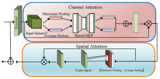 In recent years, the attention mechanism has been widely used in object detection tasks because it can make the network pay more attention to the task-relevant area. Therefore, a lightweight convolutional attention module is embedded into the residual blocks of the backbone network, which is defined as RM-a (a1, 2, 3, 4). The RM-a consists of residual basic block, a channel attention submodule, and a spatial attention submodule, as shown in Figure 3. In the channel attention submodule, the maximum pooling aims to extract the significant feature of each channel, and the average pooling is used to capture the whole statistics feature of the channel. Following the pooling operations, a multilayer perceptron (MLP) squeezes the spatial information obtained by pooling operations and finds the importance of features per channel, focusing more on the channel with a greater amount of information. In the spatial attention submodule, the maximum pooling aims to highlight the saliency feature of local regions, and the average pooling is used to integrate global spatial information. Following the pooling operations, a convolution layer with the kernel size of 7 × 7 is used to generate a spatial attention map, which help the encoder network to emphasize the significant regions and suppress the spatial noise. Finally, the input of the RM and the final output of the spatial attention submodule are added through the skip connection operation to enhance the representational ability of the network.