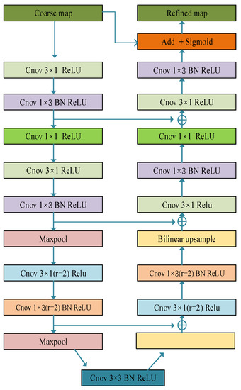 In order to effectively utilize the features of defect objects, a deep supervision mechanism [33] was proposed to supervise the coarse saliency map generated by each URB of the decoder network, as shown in Figure 2. Furthermore, a residual refinement network (RN_1D) consisting of one-dimensional filters is proposed to further refine the last prediction map of the URB output, as shown in Figure 5. We choose the last prediction map because of its richer significant information.