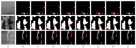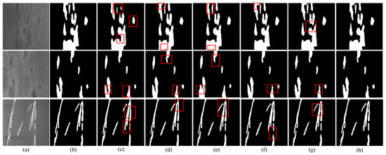 Visualization of the results of different losses. (a) Strip steel surface images; (b) ground truth; (c) ; (d) ; (e) ; (f) +; (g) +; and (h) (ours). Red boxes indicate areas where defects are incomplete.