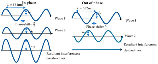 The DHSPI technique, based on the interference principle [8], is illustrated in Figure 1. Interferences are based on the wave properties of light. The propagation of light waves is periodic and this periodicity depends on the wavelength of the light. When two coherent light waves are superimposed with the same periodicity and intensity, they can interfere. There are two types of interference: in-phase and out-of-phase. In-phase interference means that the maxima of both waves and their minima occur at the same time, and the resulting intensity is twice the intensity of one wave. The phase difference is 0 [2π]. Out-of-phase interference occurs when the maximum of one wave is at the same time as the minimum of the second wave, so the resulting intensity is 0. The phase difference between these two waves is π [2π].