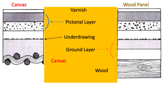 In this article, the work has been focused on the wooden painting panels that are widely found in museums. A wooden panel has a complex structure (Figure 3): the support is made of wood, and then the preparation layer of gesso is mixed with glue composing the painting support. A pattern can be drawn directly on this layer, followed by the application of paint, which can sometimes be covered with a glaze mixture. A varnish is applied to the top of the wood panel [20] to protect the paint layer and increase the saturation of the colours [21].