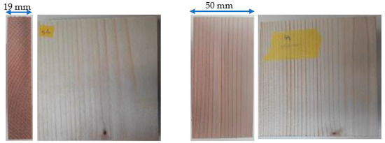 Sample 51 (left), spruce dimensions of 100 × 100 mm and a thickness of 19 mm. Sample 44 (right), spruce dimensions 100 × 100 mm and a thickness of 50 mm.