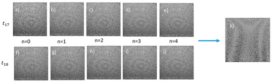 Pre-processing result: interferogram between time t = 85 min and time t = 90 min of sample n°51. Data acquired by DHSPI from image (a–e) for time and images from (f–j) after five minutes at the time . Image (k) is the interferogram between time and obtained from Equation (5).