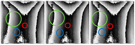 Then, the second possible denoising algorithm SCA-SWT is tested. The method has been tested first on the raw interferogram Figure 8 image (a) and image (c) and on the interferogram denoised by the MatLab median filter with symmetric padding and the 3 × 3 window Figure 8 images (b) and (d). The second denoising algorithm was not preceded by any previous denoising in the article of Ning et al. [15]. Images (a) and (b) are tests on the interferogram of sample 51 between the beginning of the experiment and five minutes later whereas images (c) and (d) are tests on the interferogram of sample 44 between the beginning of the experiment and five minutes.