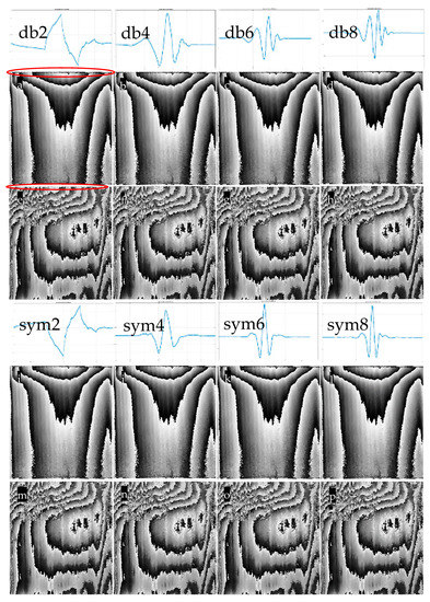 To that end in Figure 9, the different kinds of wavelets were tested on an interferogram of sample 51 between 15th min and 20th min after the beginning of the experiment for images (a) to (d) and (i) to (l), the same processing was applied on interferogram of sample 44 between 5th min and 10th min after the beginning of the experiment for image (e) to (h) and (m) to (p). The results applied to the two mock-ups are shown with the shape of the wavelet. Before using the denoising process, the interferograms are denoised with the Matlab function ‘medfilt2’ with parameters symmetric padding and a window size of 3 × 3. The computing time is increasing with the increase of the peak number of the analysing wavelet. Two kinds of wavelets data treatment have been tested and compared Daubechies (db) and Symlets (sym) analysing wavelets to identify if our methodology is most relevant for the experiment which has been performed, the other parameters of the method are a five-level decomposition, an alpha equal to 6.25 and a Birgé-Massart threshold.