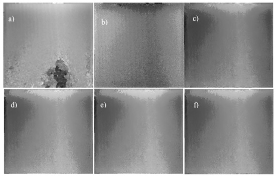 The inputs of the function depend on the denoised interferogram. Indeed, Figure 10 is the unwrapped phase of Figure 9 image (a) that has fewer fringes than Figure 9 image (e), they are the chosen denoised images of mock-up n°51 and mock-up n°44 respectively to be unwrapped with CPULSI algorithm. To unwrap these two different images, the error to reach is set to 0.001 and the number of iterations is equal to 300. Figure 9 image (a) unwrapping ends because the error 0.001 is reached, contrary to the unwrapping of Figure 9 image (e) which unwrapping ends because the 300 iterations are reached. To improve the unwrap image, for image (a) the error to reach has to be improved, as shown in Figure 10 image (f) but for Figure 9 image (e) the number of possible iterations has to be improved as shown in Figure 11 image (e). The conclusion can be made that the inputs of the function depend on the obtained interferogram and that if more fringes are seen, more iterations will be needed.