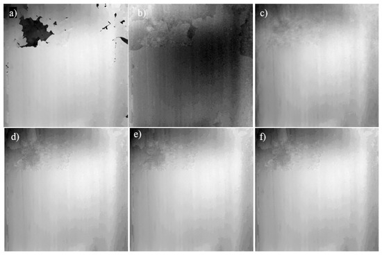 The pre-processing step is the reconstruction of the interferogram [9,10,11,12,13]. For this purpose, one needs the images obtained in the initial state and the deformation state. On the one hand, the initial state can be the time of the beginning of the experiment, denoted , and the deformation time is the set of other times of the DHSPI acquisitions, i.e., from time to time On the other hand, the initial state can be time and the deformation time the next one, the time . The method is the same for both cases, but the second method is used in this experiment because if the technique were to be applied to a work of art in a museum, it would be logical to compare two images with the minimum time difference. During the acquisition of the DHSPI, five images of the surface of the object under study are recorded in order to optimise the signal-to-noise ratio. At time , the pixel intensity of each image is formulated as: