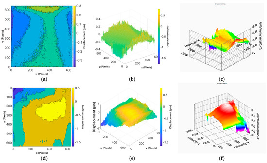where is the displacement of the surface at pixel , is the laser wavelength and is the calibrated unwrapped phase at . The result of each pixel calculation is a deformation map that gives a quantitative displacement of the surface. The deformation maps can be drawn in 2D using the ‘contourf’ MatLab function or in 3D by the ‘mesh’ function.