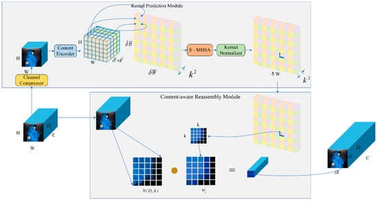 CARAFE can fully retain the semantic information of feature maps without adding too many parameters, thereby reducing the computational costs. CARAFE mainly consists of two modules: a content-aware reassembly module and a kernel prediction module. The role of the kernel prediction module is to generate a reconstructed convolutional kernel. Assuming that the input image size is C × H × W, where C represents the number of channels, W and H represent the height and width of the image, respectively. Firstly, to reduce the complexity, the input channels C is compressed into Cm using the 1 × 1 convolution within the channel compressor module. The content encoder module then performs convolution operations on the feature map output from the previous module, generating reassembly kernels of size H × W × × . Finally, all channels for each pixel are normalized by using softmax, so that their weights are summed to 1. The weights reflect the correlation between different channels. The content-aware reassembly module first performs the weighted sum operation on the reassembly kernel, reassembling the features within the local region. Then, each pixel of the original input feature map selects a k × k region for convolution and, finally, performs the inner product with the reassembly kernel to obtain an output feature map of size C × δH × δW.