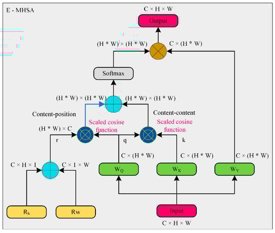 Firstly, two learnable parameter vectors (Rh and Rw) are initialized, and they are logically added through the broadcasting mechanism; then, the encoding of the (i, j) position is (Rh + Rw), and the size of the encoding matrix is (H ∗ W) × C. Next, the input feature map of size C × H × W is passed through three independent 1 × 1 convolution and transposed to generate q, k, and v encoding matrices of size C × (H ∗ W). In the original MHSA, the similarity between different input features is measured using dot product calculation. However, as known from [28], when using dot product calculation, certain pixel pairs can have a significant impact on the learning attention of some blocks and heads. To address this problem, in this article, we use the scaled cosine function instead of the traditional dot product calculation. As shown in Equations (2) and (3), firstly, q, r and q, k are passed through the scaled cosine function to generate the content–position and content–content encoding matrices of size (H ∗ W) × (H ∗ W), respectively, and then they are logically added and sent to the softmax function to generate a similarity feature matrix of size (H ∗ W) × (H ∗ W). Finally, using the dot product calculation with the value encoding matrix, an output feature map of size C × H × W is generated.