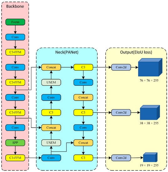 As shown in Figure 1, the YOLOv5 network structure consists of three main parts: backbone, neck, and output. In YOLOv5, the backbone network mainly consists of the focus module, the wrapped convolution module, the C3 module, and the SPP module. The focus module performs slicing operations on the input images; the C3 module increases the feature representation ability of the network, reducing memory consumption and parameters while maintaining the accuracy of feature extraction. The neck network is designed to make better use of the features extracted from the backbone network; it reprocesses different-sized feature maps. In the fusion process, the structure of FPN and PAN is used. The output classifies the categories and location of the target via the feature map from the fusion of the neck network. Rather than using fully connected layers, YOLOv5 uses three 1 × 1 convolutional layers to predict the confidence, category probability, and prediction box coordinates of objects on three different-sized feature maps.