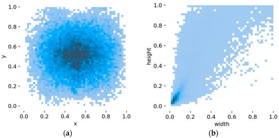As shown in Figure 7, we visualized the distribution of object box occurrences and sizes in the dataset. Figure 7a represents the position of the object boxes’ centroids in the image after normalizing the image sizes, and it can be observed that the objects are mostly concentrated in the center of the images; Figure 7b represents the ratio of the size of object boxes to the size of images, where it can be observed that the objects vary in size.