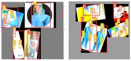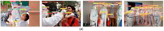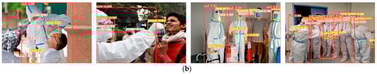 As there is no relevant large dataset of medical personal protective equipment available, the dataset used in this article was derived from images screened in CPPE-5 [31] as well as from our collection of medical personal protective equipment images, ultimately obtaining 2500 images with five categories—suit, mask, glove, face shield, and goggle—as shown in Figure 6, containing different scenarios as well as small targets small targets and obscured targets. The dataset was then expanded to 5000 images by panning, rotating, cropping, and color jittering. The number of the different categories in the dataset is shown in Table 1. Finally, we used the LabelImg tool to label every face in each picture in the dataset and to determine its category and coordinate information in order to obtain the real box to annotate the dataset and save the labels in xml format. As the YOLO series algorithms load tag files in txt format, the format of the tag files needed to be converted to txt format.