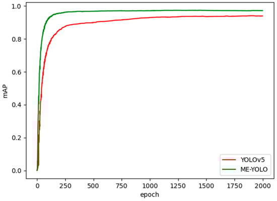 In this study, we used six evaluation metrics to evaluate the performance of ME-YOLO: precision (P), recall (R), mean average precision (mAP), F1-score, gigaflops per second (GFLOPS), and frames per second (FPS). Precision (P) indicates the number of correctly detected samples as a percentage of the total detected samples, which can reflect the classification ability of the model for the object. Recall (R) indicates the number of correctly detected samples as a percentage of all real samples, which can reflect the detection ability of the model for the object. AP is the average of the precision at different recall, while mAP is the average of AP under all categories, which can reflect the overall performance of the model. The F1-score combines the results of the precision and recall, and model performance is proportional to the F1-score. GFLOPS means one billion floating point operations per second—the smaller the better. The formulae are as follows: